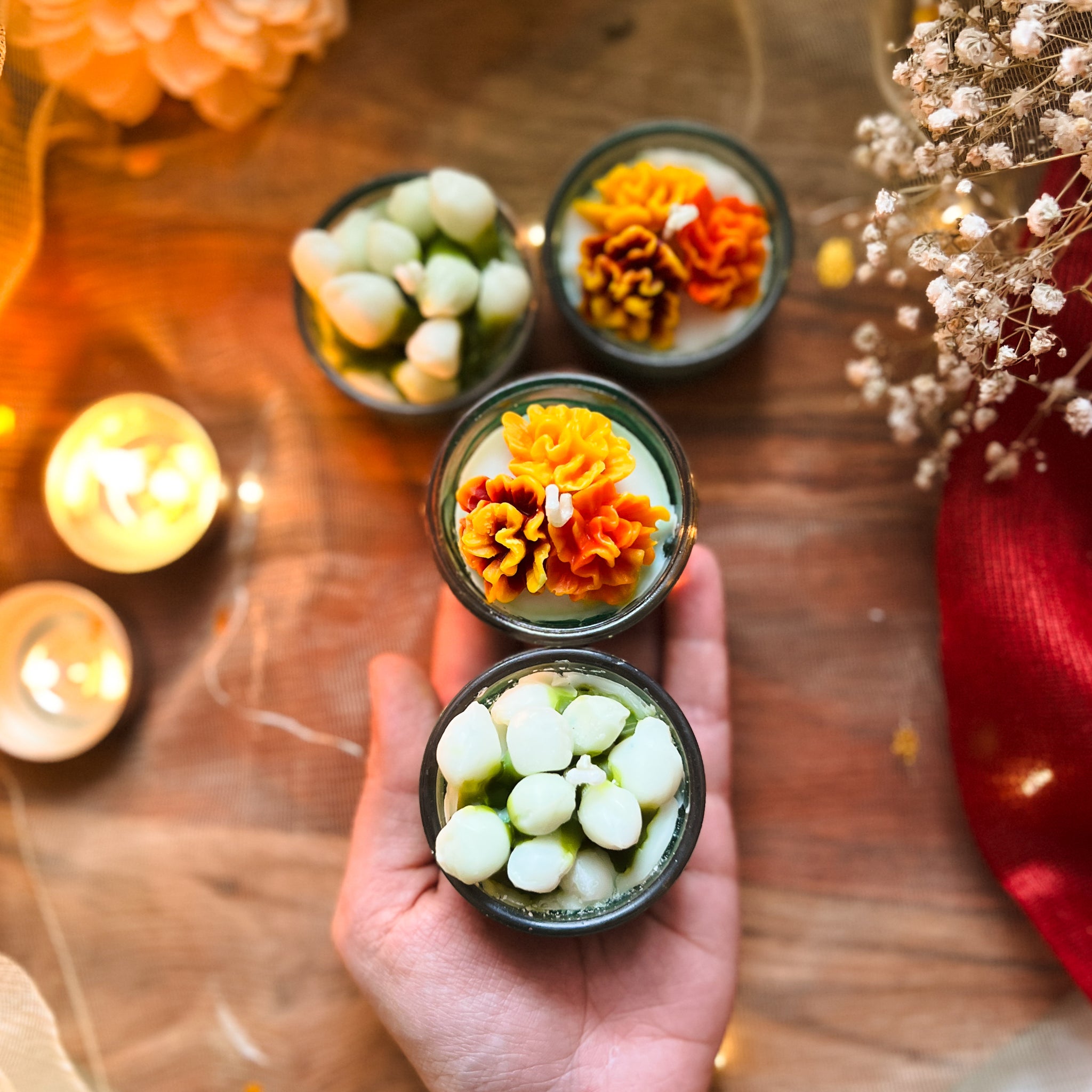Handcrafted Artisanal Decorative Genda-Mogra Tea-Light Soy Candle Set comes as a set of 4 clear glass votives, with realistic wax flower detailing inspired from bright lively Marigolds (Genda) & Jasmine (Mogra) buds. Each detailing is authentically handcrafted in 100% Organic Soy Wax, infused with premium fragrance oils (Sulphate, Pthalate & Paraben Free); and hand-poured in re-usable glass votives with blended wax emerald green detailing along the edges.