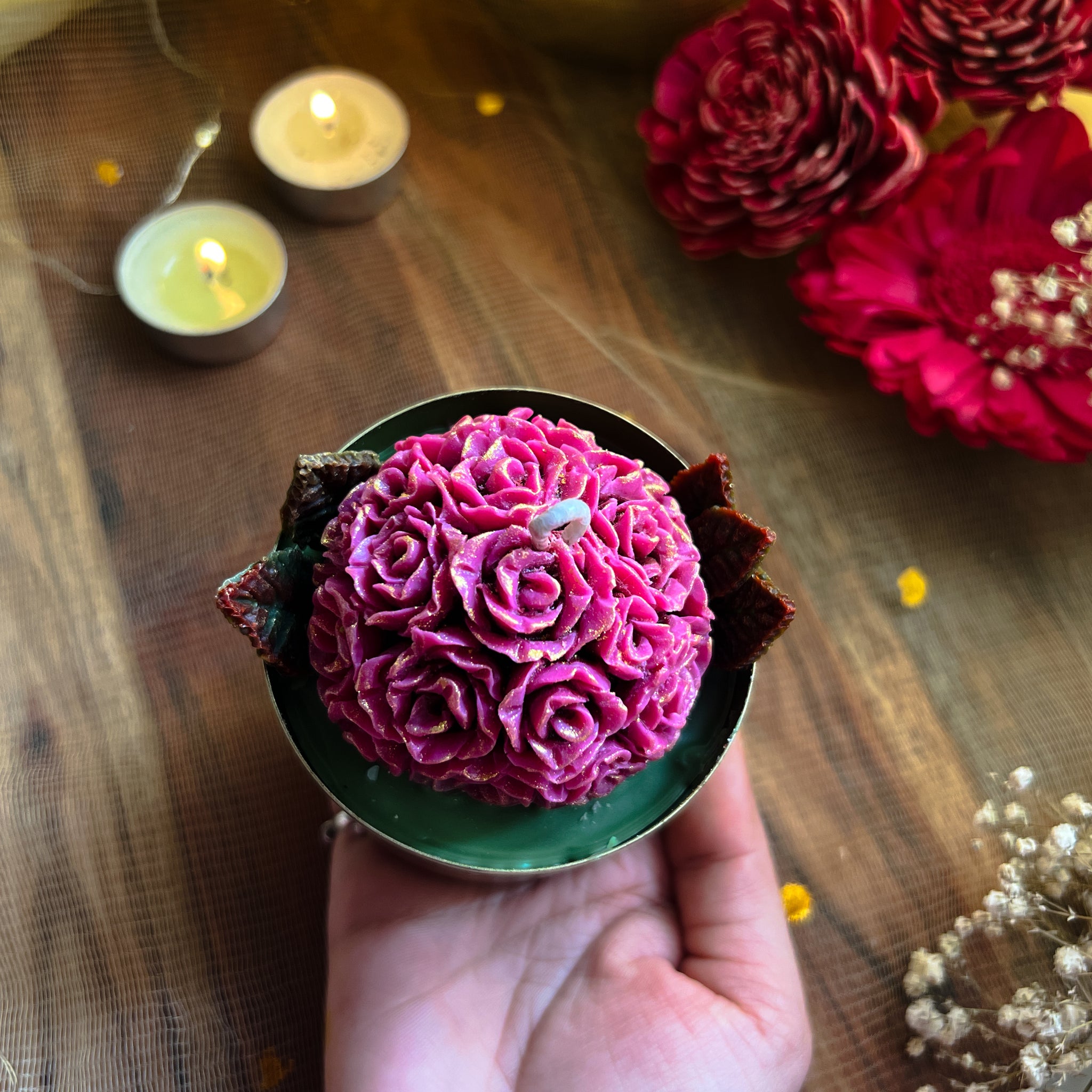 Decorative Candles are mostly used as a decor piece with occasional gentle whiffs of aroma when placed in close proximity.