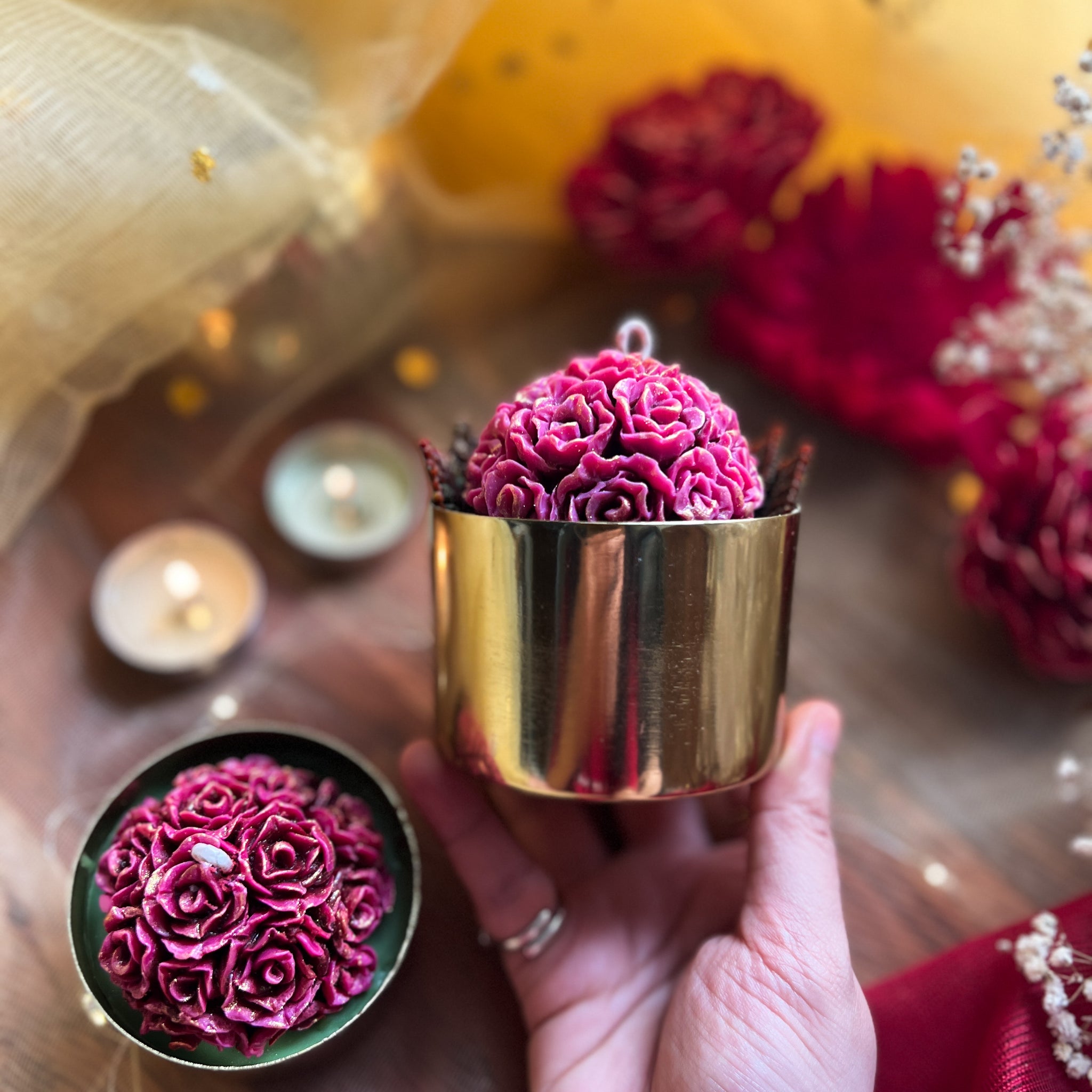 Handcrafted Artisanal Decorative Guldaan Candle comes in a lush metallic gold tinted metal jar. Inspired from a vase with a bunch of roses, Guldaan candle is handcrafted in 100% Organic Soy Wax infused with premium fragrance oils (Sulphate, Pthalate & Paraben Free).