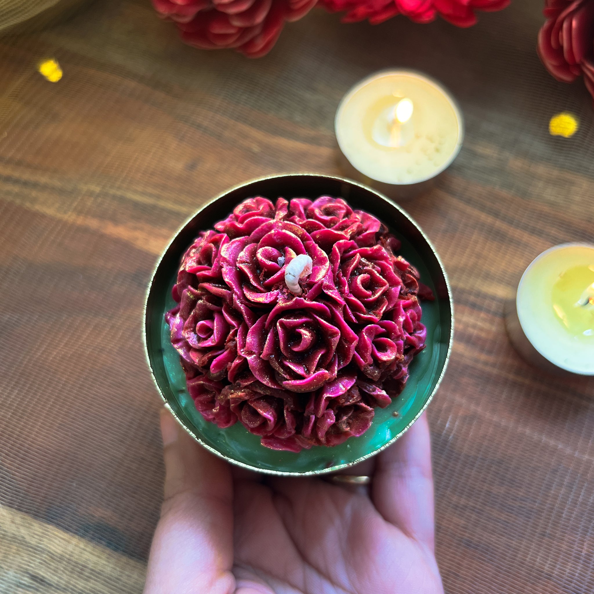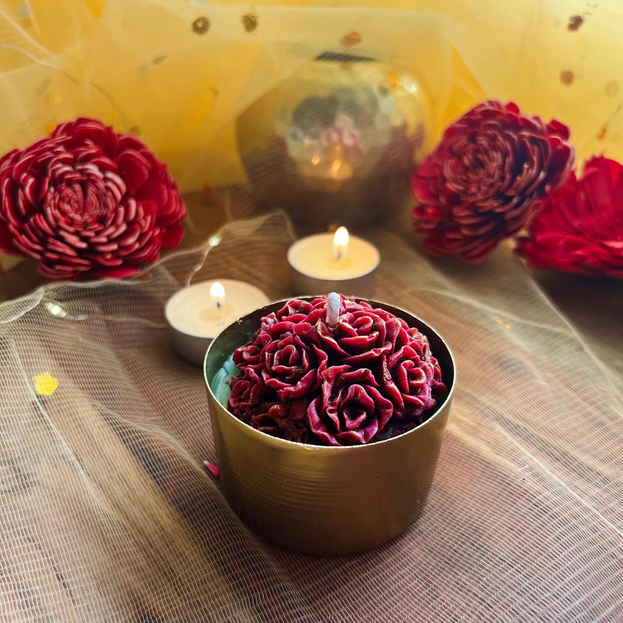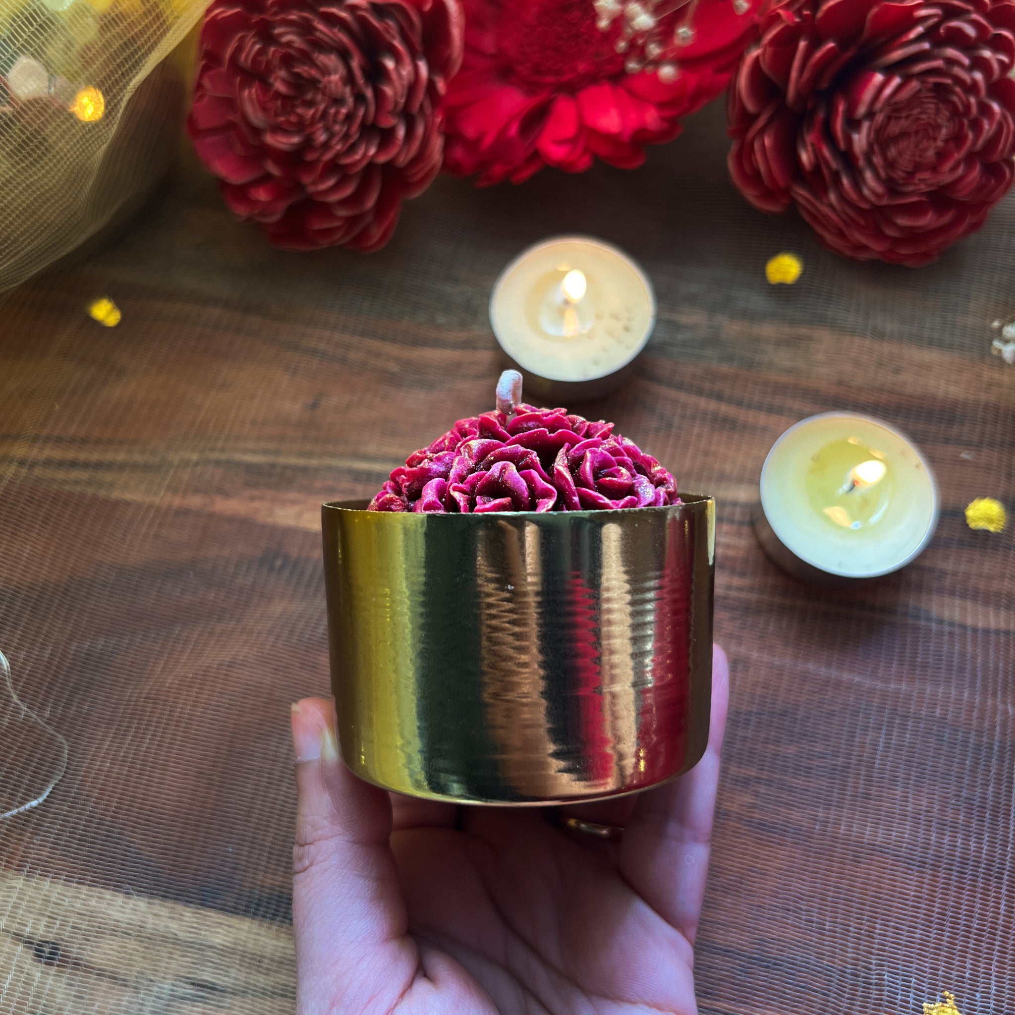Handcrafted Artisanal Decorative Guldaan Candle comes in a lush metallic gold tinted metal jar. Inspired from a vase with a bunch of roses, Guldaan candle is handcrafted in 100% Organic Soy Wax infused with premium fragrance oils (Sulphate, Pthalate & Paraben Free);