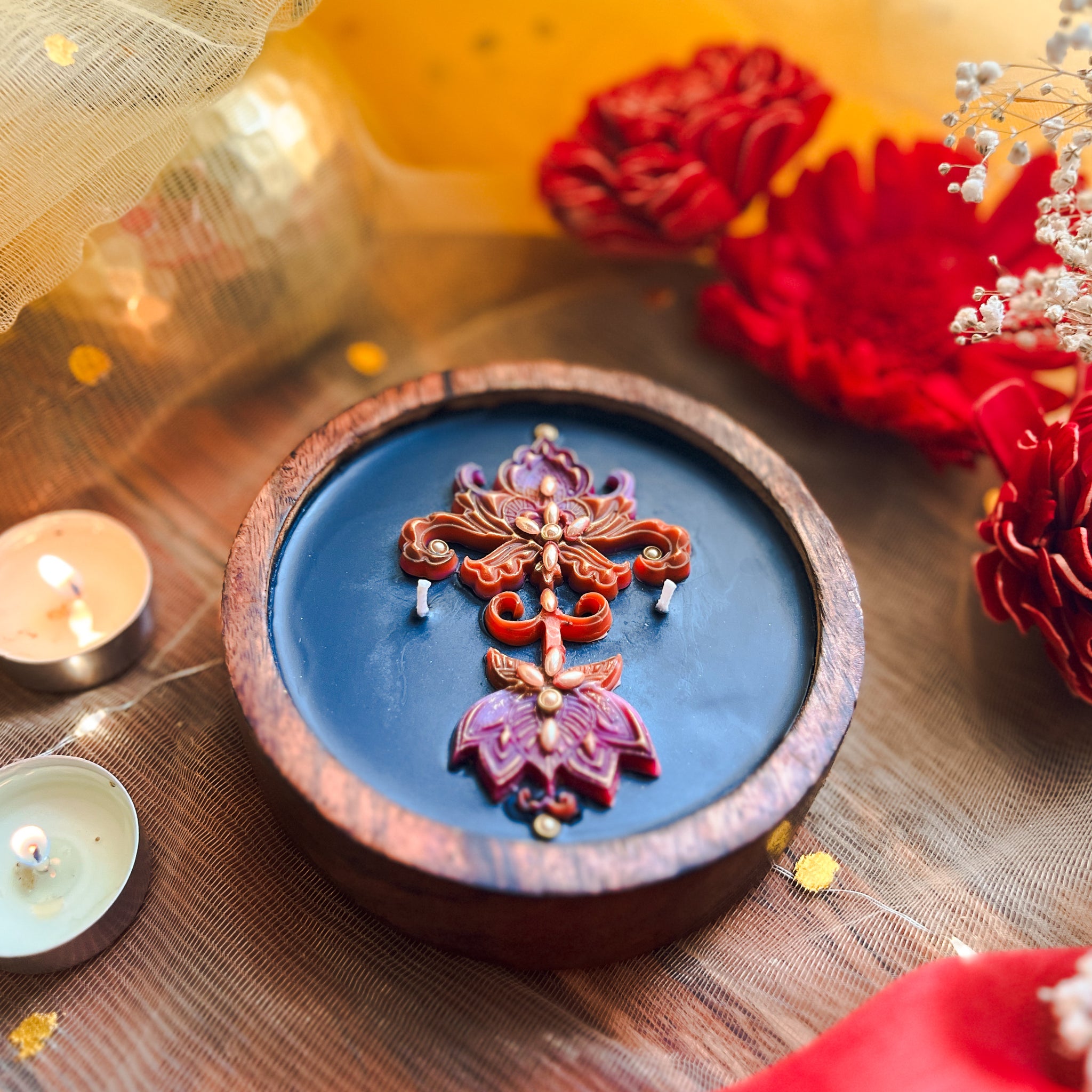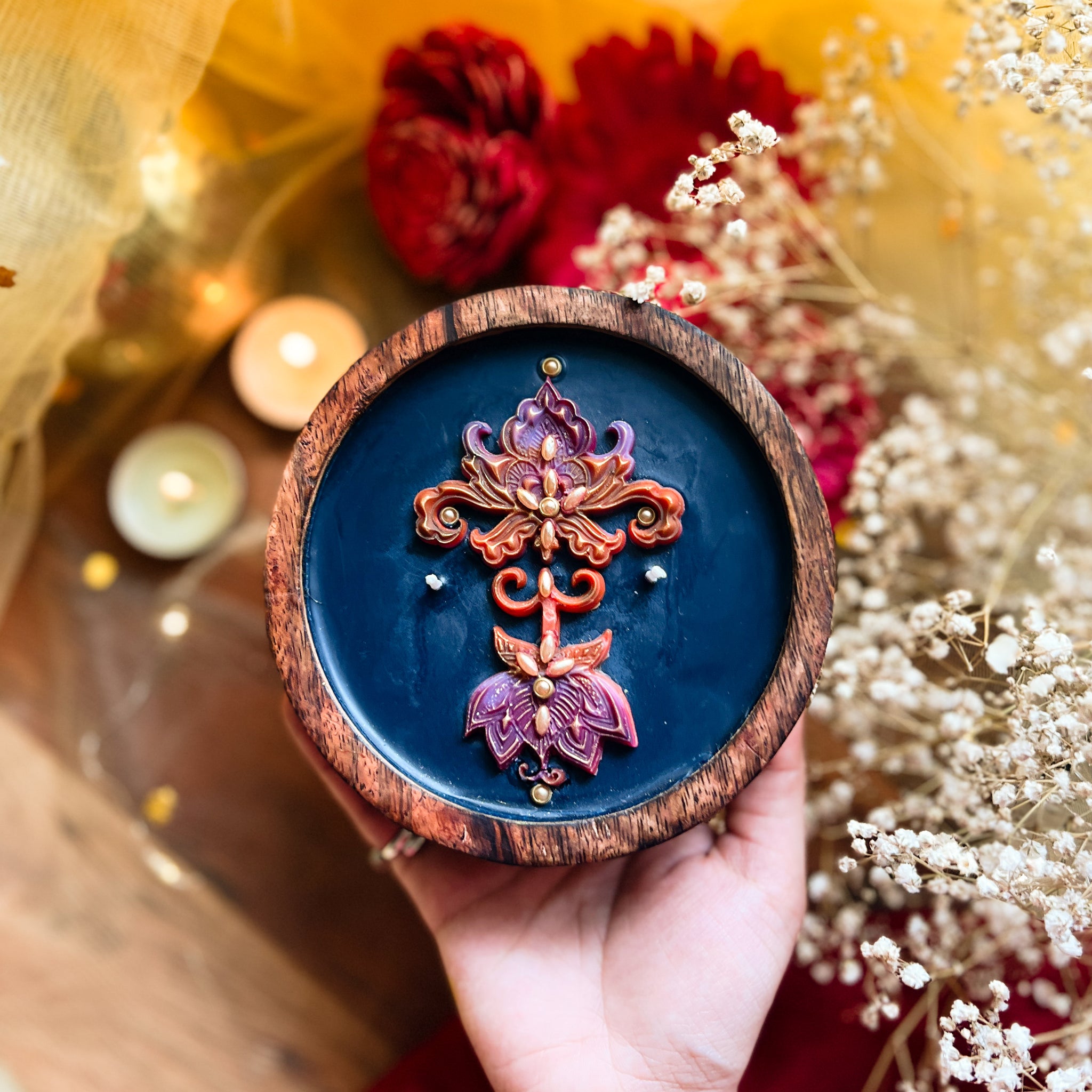 Handcrafted Artisanal Decorative Rangoli Candle comes in a Rustic Acacia Wood jar. Inspired from intricate hand drawn Rangoli/Festive art that is believed to bring oodles of good luck and blessings in the household, our Rangoli candle is authentically handcrafted in 100% Organic Soy Wax infused with premium fragrance oils (Sulphate, Pthalate & Paraben Free); and hand-poured in re-usable acacia wood container with gold highlights and pearl finish embellished accents.
